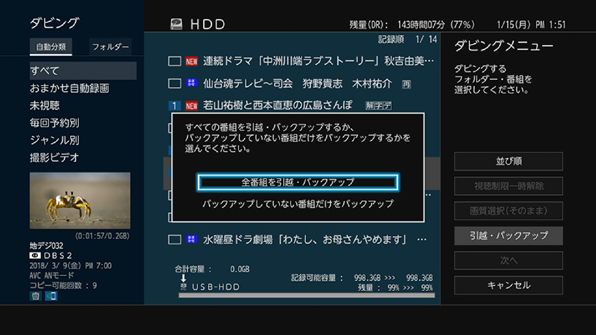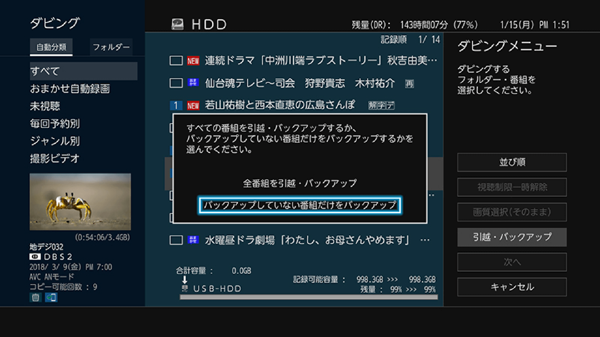 内蔵ハードディスク内の全番組をまるごとバックアップすることができます。 個別に選ぶ手間もなく、簡単に引っ越しができます。