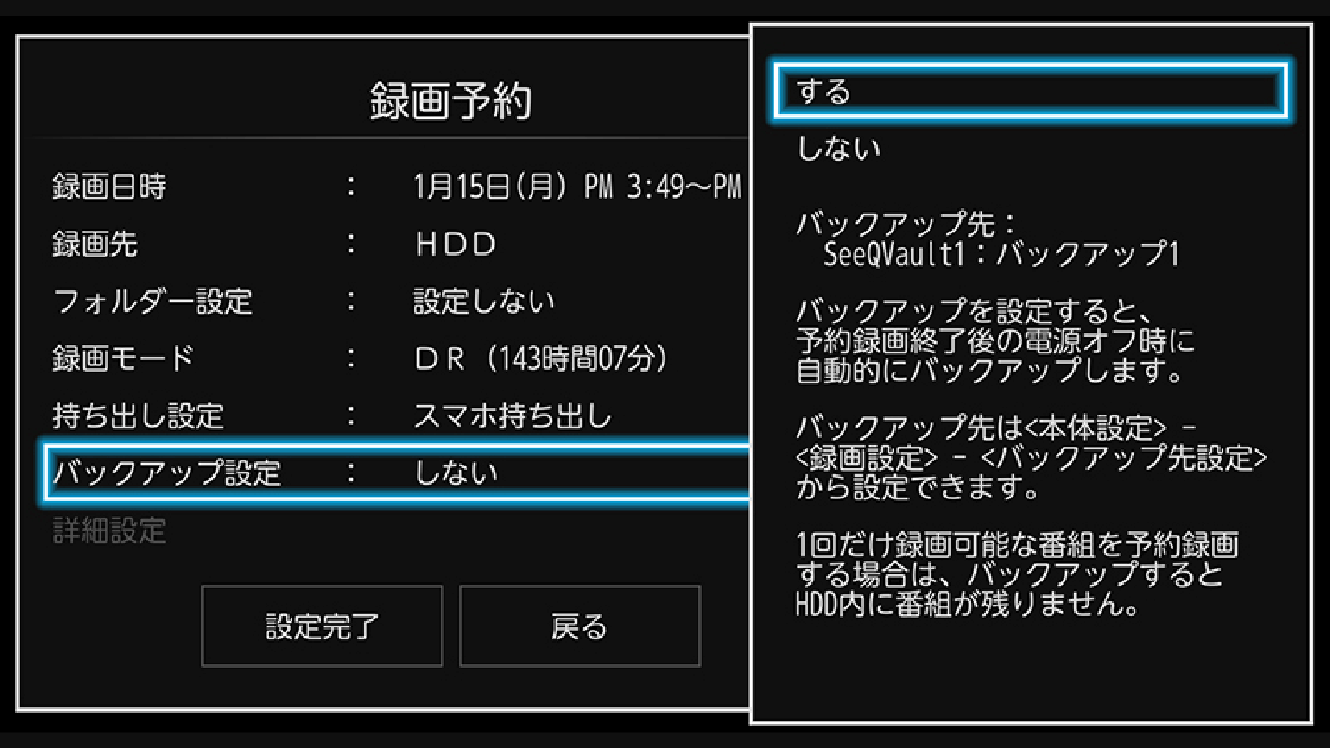 録画予約時にバックアップ設定をしておけば、録画完了後の電源オフ時に自動的にバックアップします。