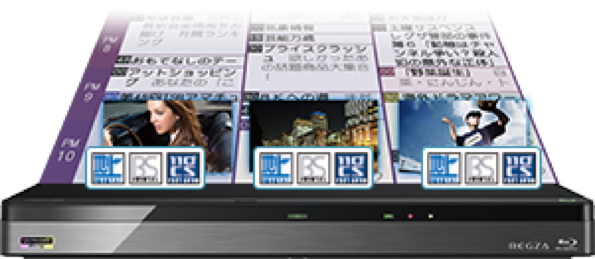 USBハードディスクに3番組同時録画*1*2することが可能です。3番組全てをAVC録画*1することもできます。