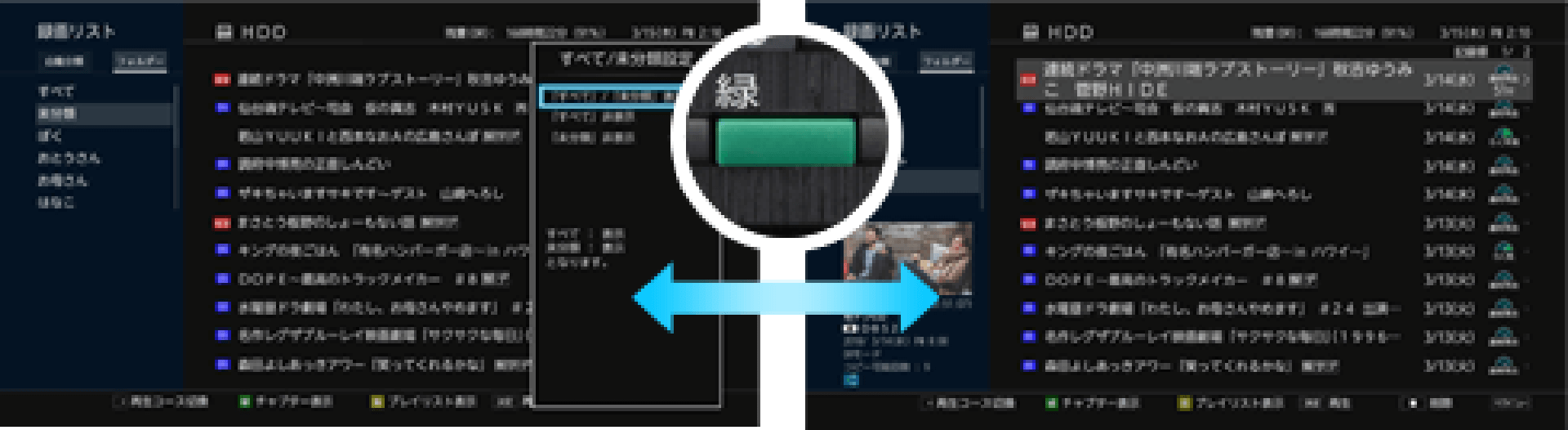 リモコンの「黄」ボタンを押すことで、作成したプレイリストのみを表示。見たい編集番組をチェックする時に便利です。