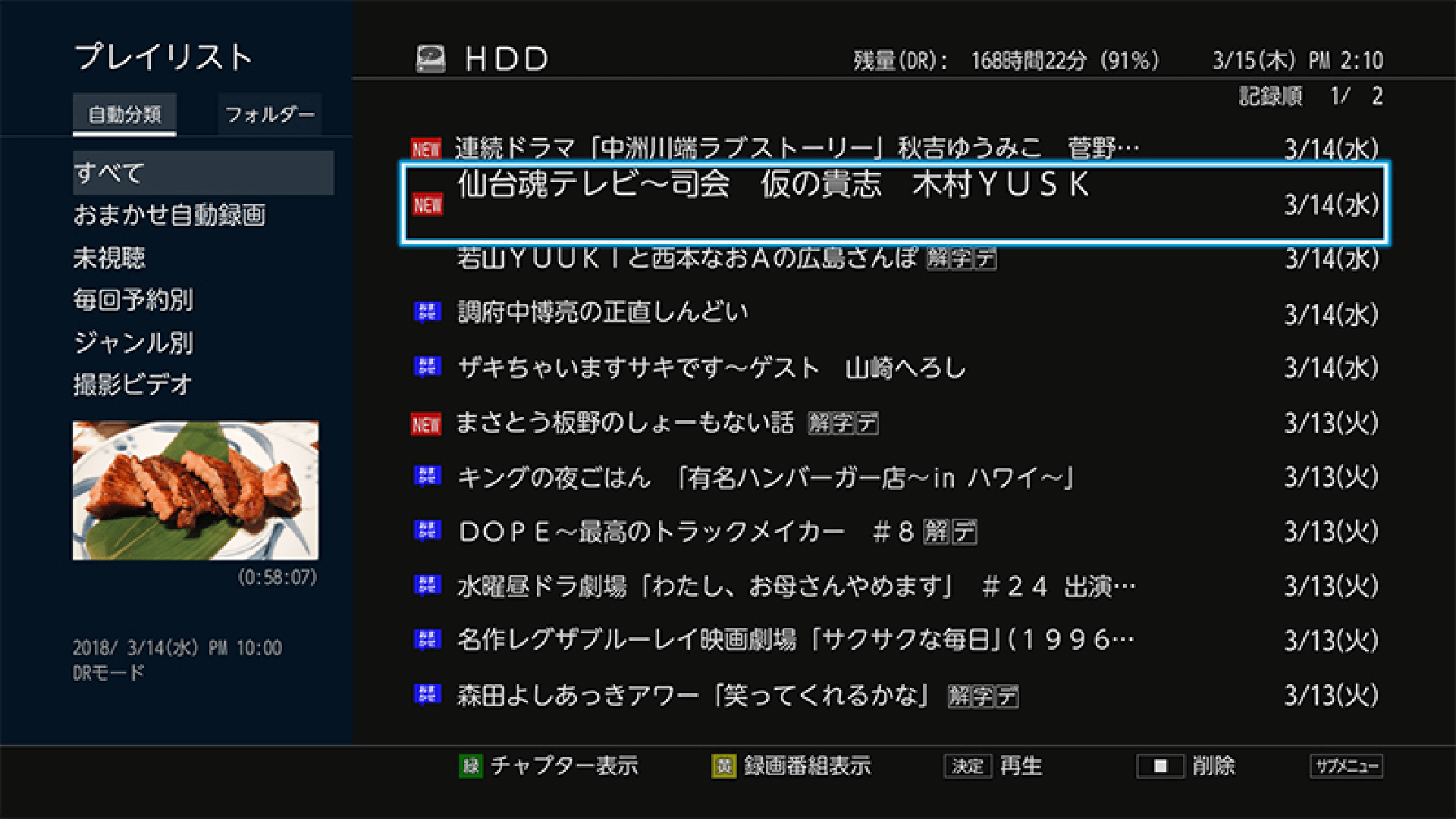 リモコンの「録画リスト」ボタンから再生することも可能。あらかじめ設定しておいたフォルダーから見たい番組を見つけられます。フォルダー設定していない番組は未分類フォルダーに追加されます。