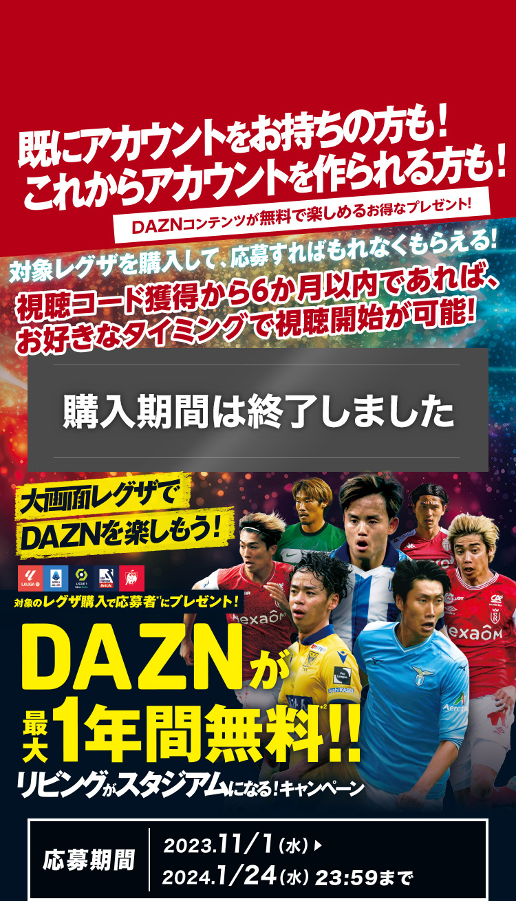 対象商品のテレビを購入し、応募期間内に応募された方にもれなくDAZN無料視聴クーポンをプレゼントいたします。