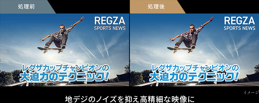 ノイズ抑制に加えさまざまな高画質処理により、地デジ番組を高画質化。クリアに再現された映像が楽しめます。また、クラウド上にある番組やジャンルごとの映像調整パラメーターを利用し、「クラウドAI高画質テクノロジー」で、さまざまな番組をさらに高画質化。