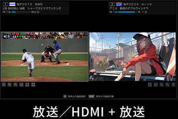 放送/HDMIと放送の組み合わせはもちろん、YouTube、AirPlay、スクリーンミラーリングとの2画面にも対応。放送を見ながらネット動画、SNS動画、ビデオ通話などマルチに楽しめます。