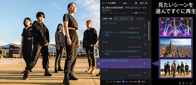 録画番組のシーンリストから見たいシーンを選択するだけで好きなアーティストの出演シーンや、ニュース番組の気になるトピックなど、見たいシーンがすぐに楽しめます。