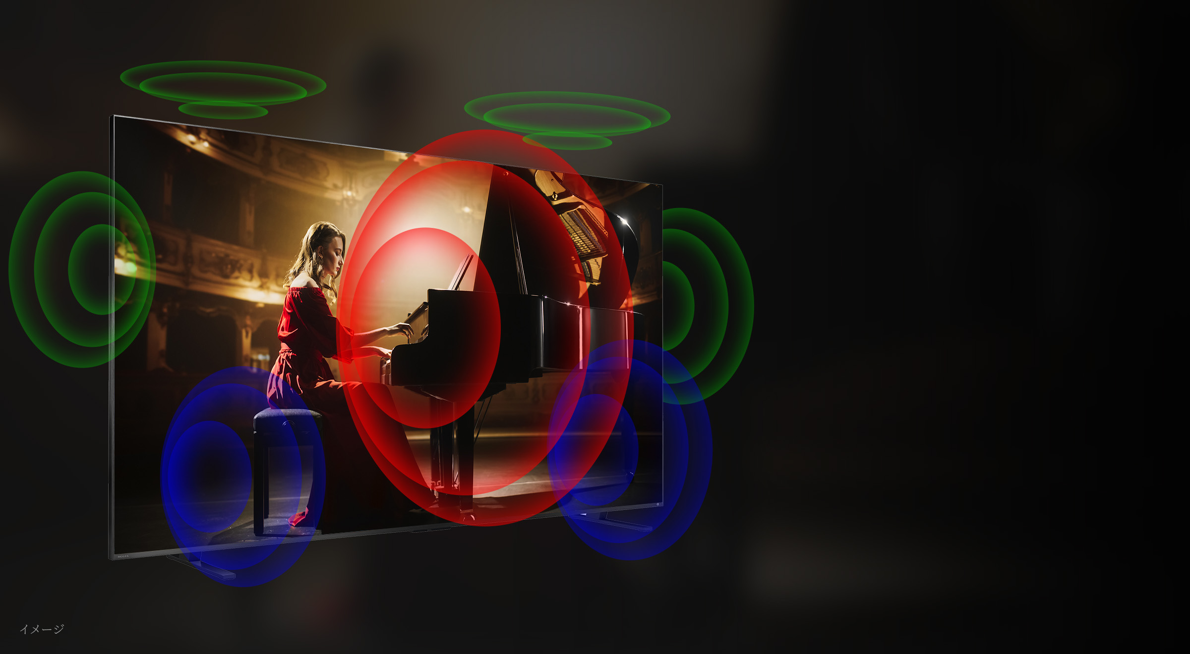 20個のスピーカーを最大出力110W* マルチアンプで独立駆動。トップスピーカーとサイドスピーカーにより音の拡がりと定位を強化。5.1.2チャンネルでリアルな迫力ある音場空間を実現。さらにイマーシブサウンド360 PROにも対応しています。