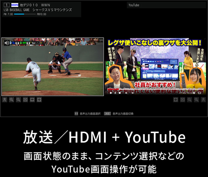 放送/HDMIと放送の組み合わせはもちろん、YouTube、AirPlay、スクリーンミラーリングとの2画面にも対応。