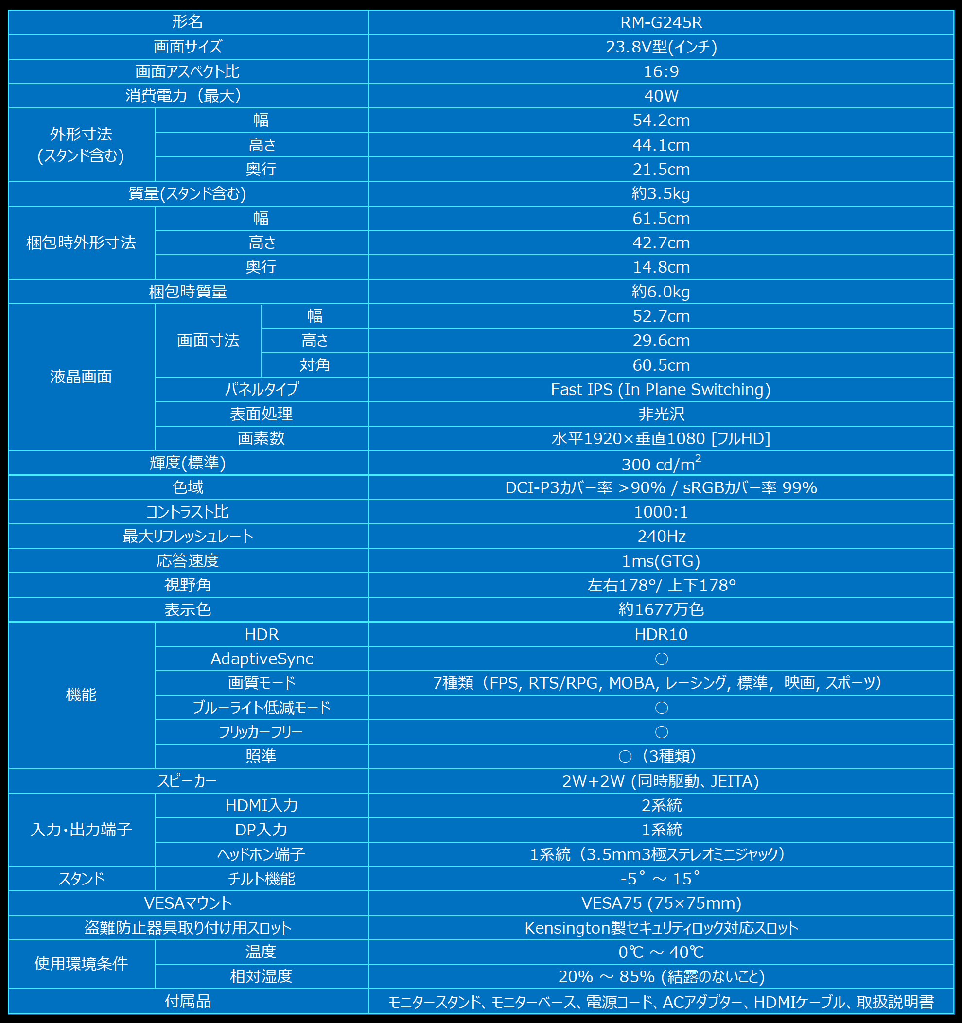 HDR10 / AdaptiveSync / ゲームモード(画質モード7種類) / 暗部強調(ブラックゲイン) / 照準