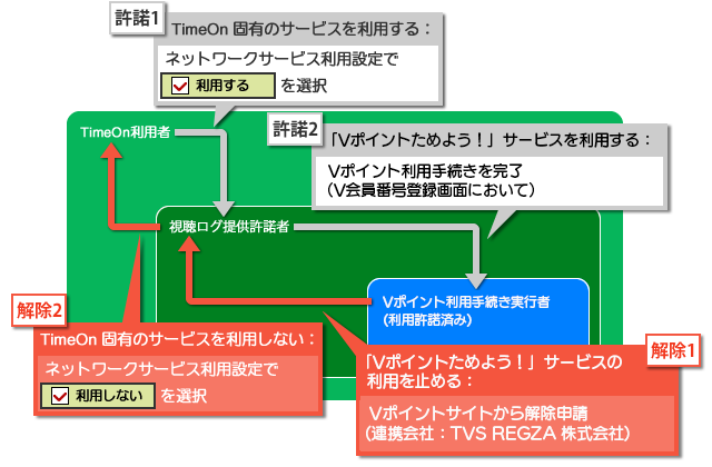 「Vポイントためよう!」サービスを利用せず、「レグザナビ」などのサービスを使うだけの場合、TimeOn 利用者の利用履歴の扱いはどうなっていますか?