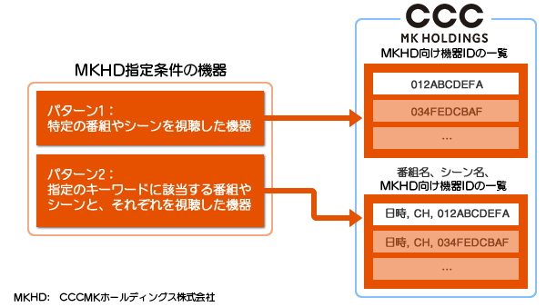 (2) 指定の番組やシーンが放送された時間帯と、それを見た機器。この場合は、番組名またはシーン情報と、その番組やシーンを見たMKHD向け機器IDのリストをMKHDに送付します。
