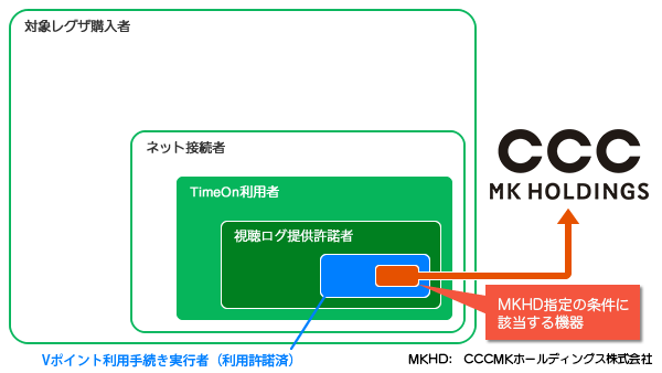 提供対象となりうる機器は、「Vポイントためよう!」サービスのVポイント利用手続き(V会員番号登録)画面から、V会員番号の登録を完了いただいたお客さまの機器に限られます(2024年4月以前にTポイント利用手続き(Tカード番号登録)を行っていただいたお客様の機器も含まれます。)。さらにその中で、CCCMKホールディングス株式会社 (以下、MKHD) が 希望する条件に合致したお客様の視聴履歴に基づく情報だけMKHDに提供されます。