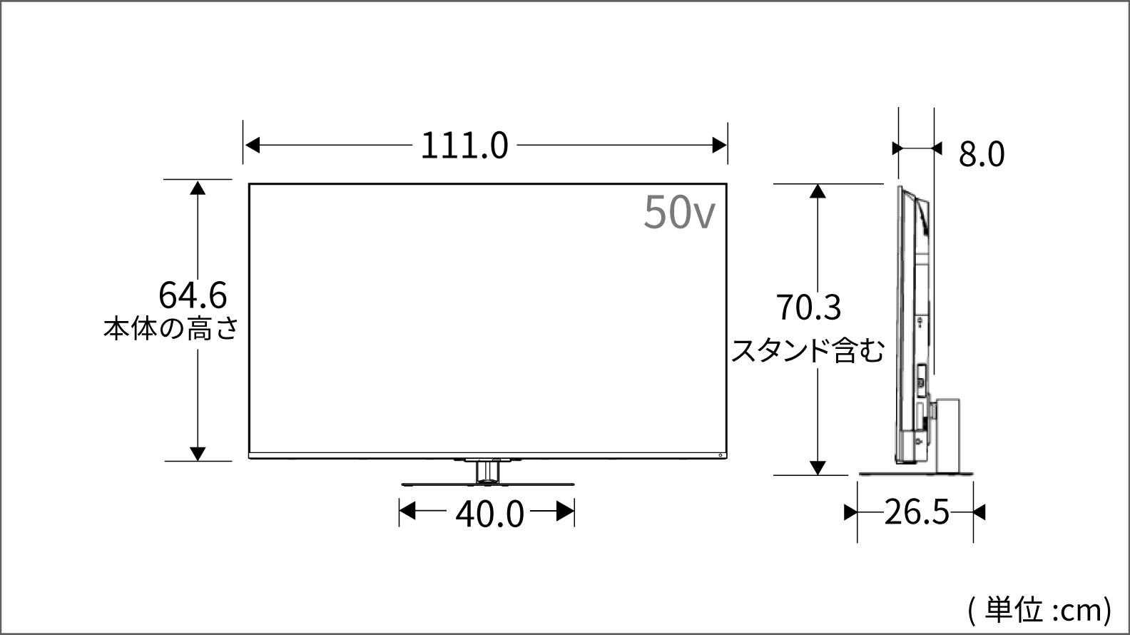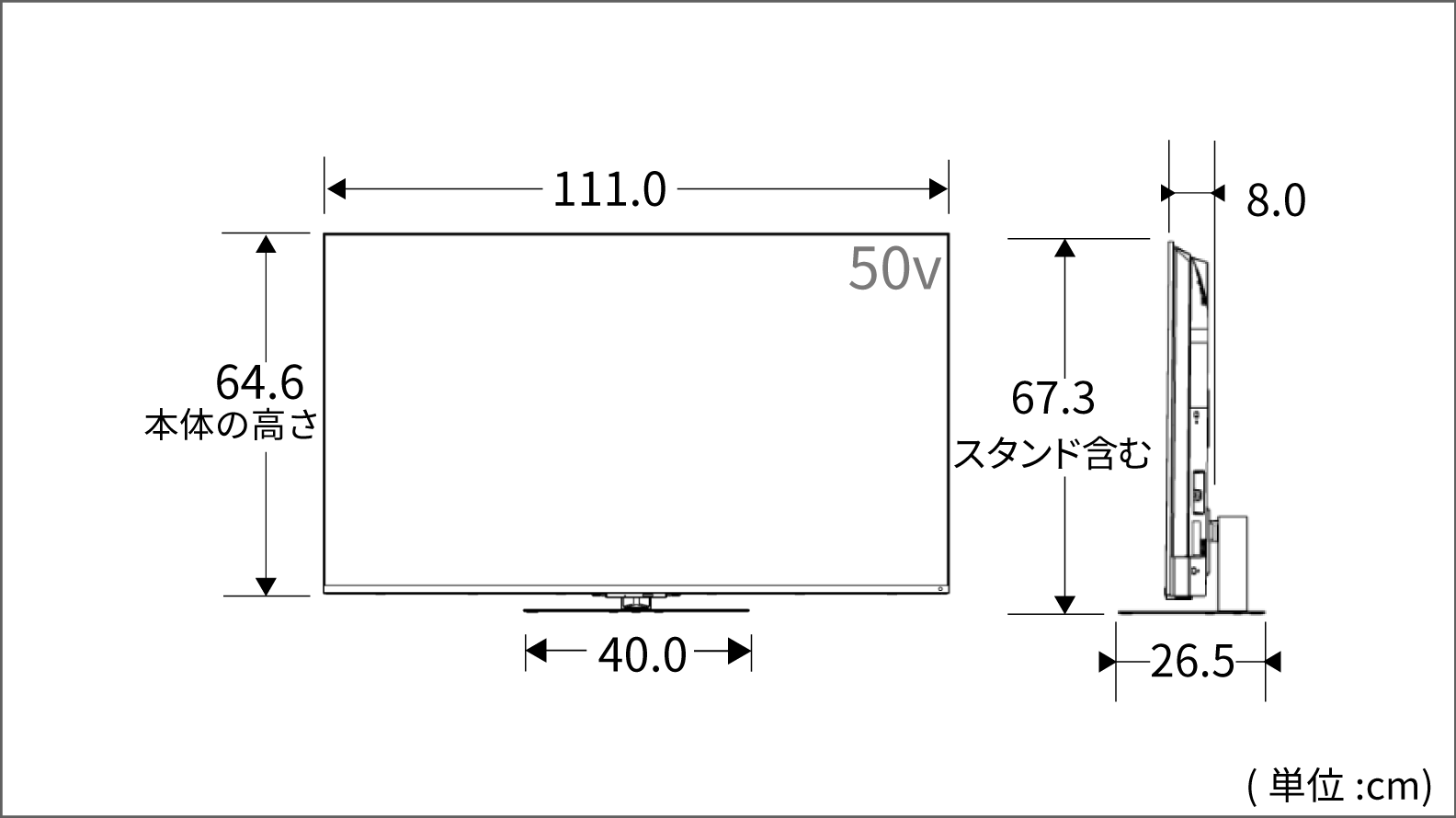 外形寸法(スタンド付き) 幅 111.0cm,高さ (低)67.3cm/(高)70.3cm,奥行 26.5cm