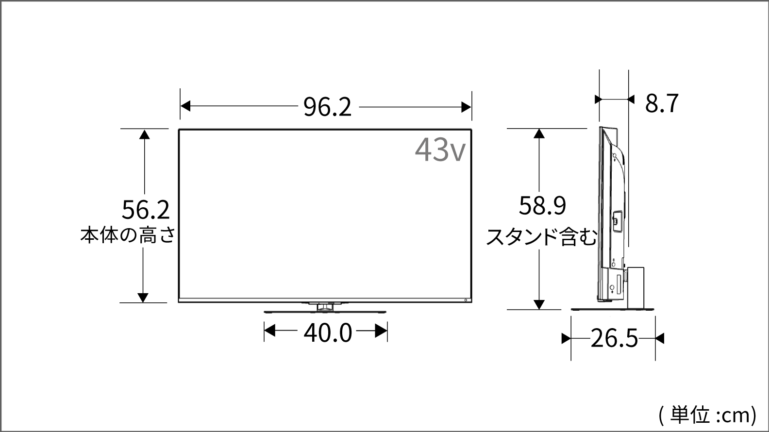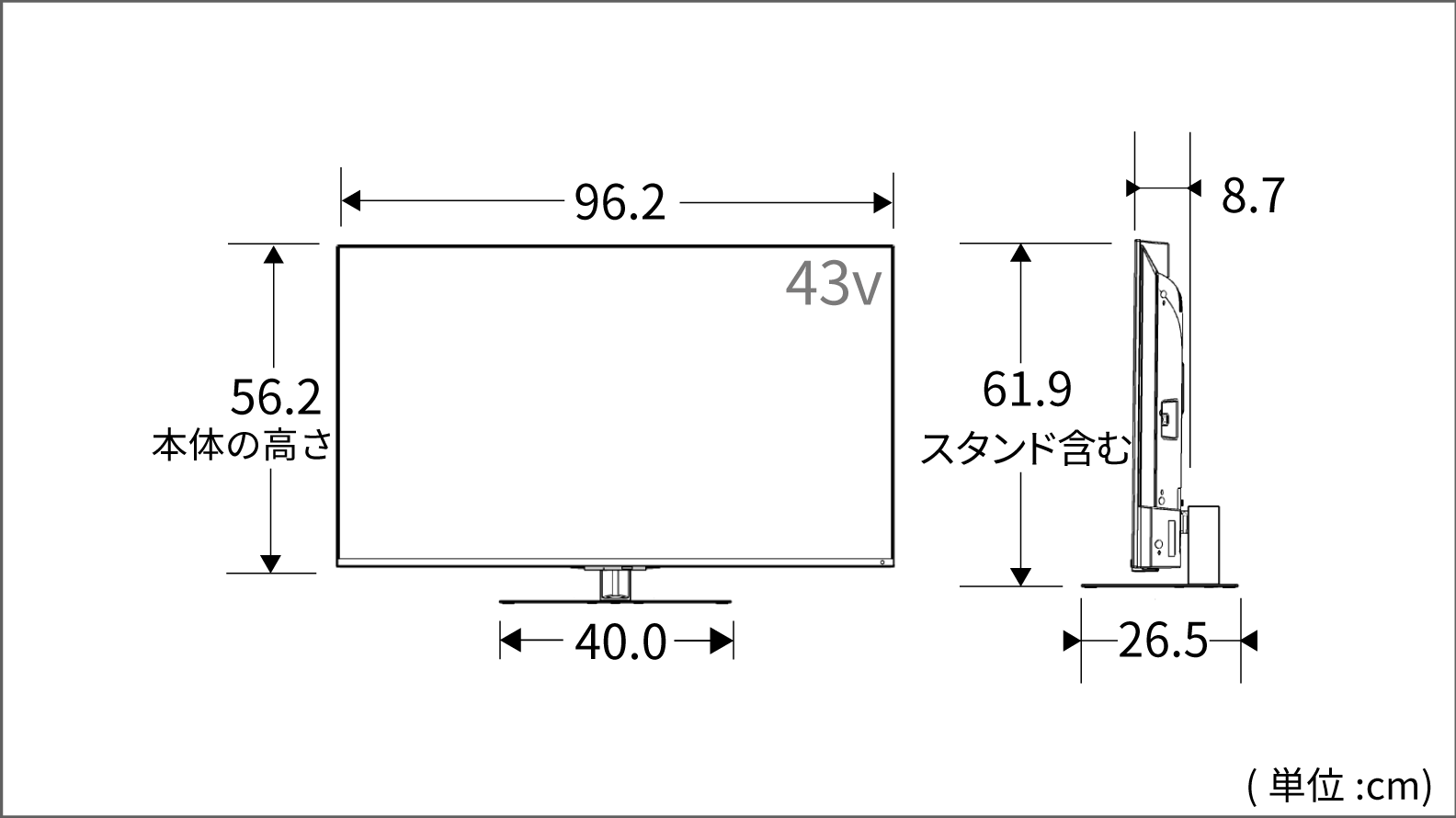 外形寸法(スタンド付き) 幅 96.2cm,高さ (低)58.9cm/(高)61.9cm,奥行 26.5cm