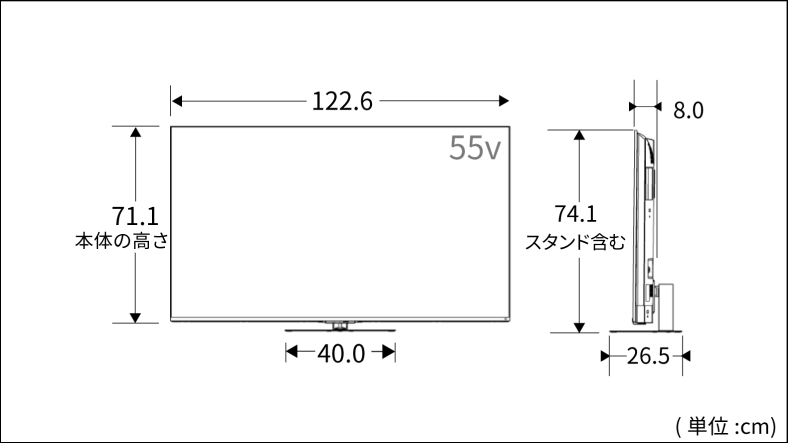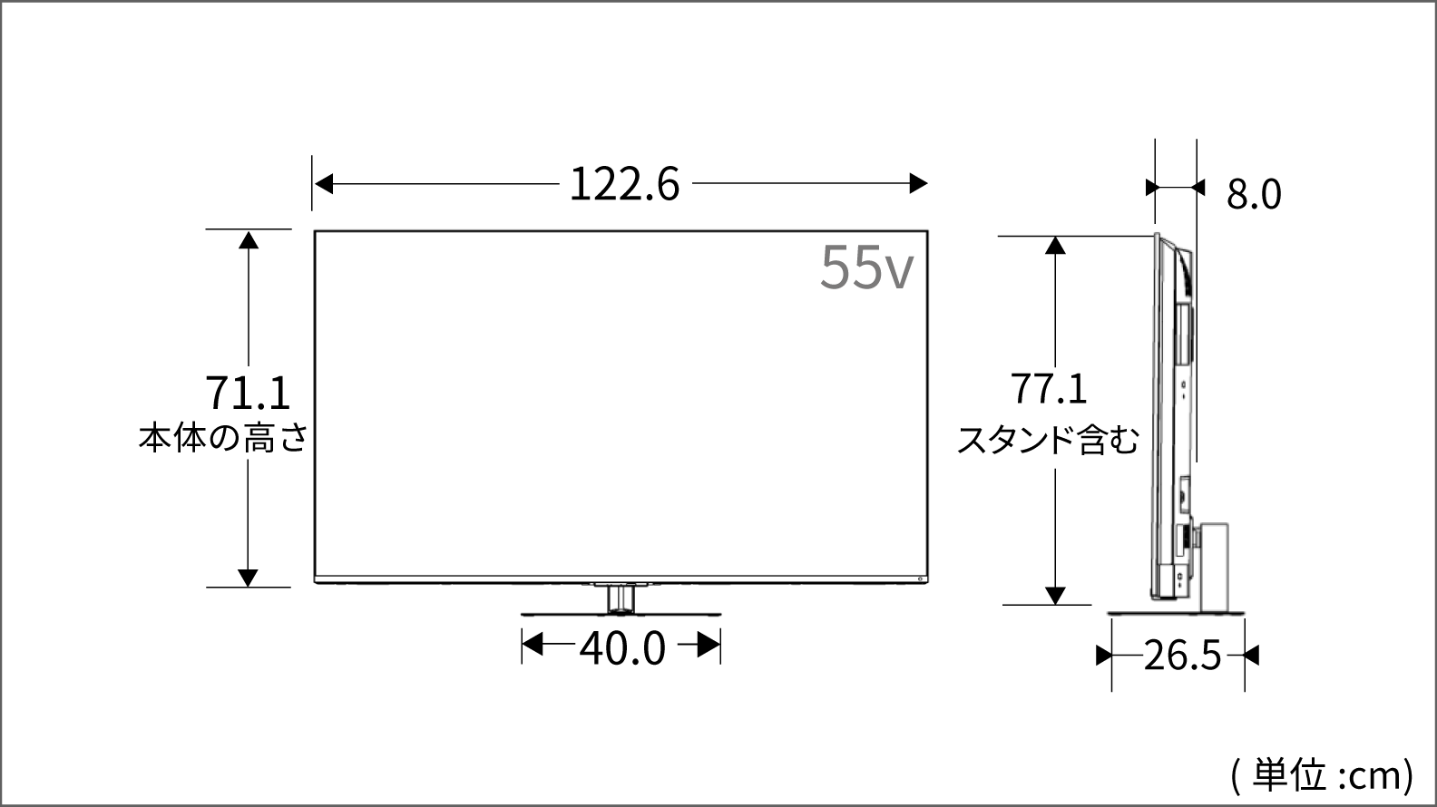 外形寸法(スタンド付き) | 幅 122.6cm,高さ (低)74.1cm/(高)77.1cm,奥行 26.5cm |