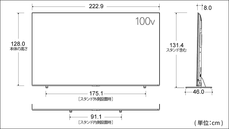 外形寸法(スタンド付き) | 幅 222.9cm,高さ 131.4cm,奥行 46.0cm |