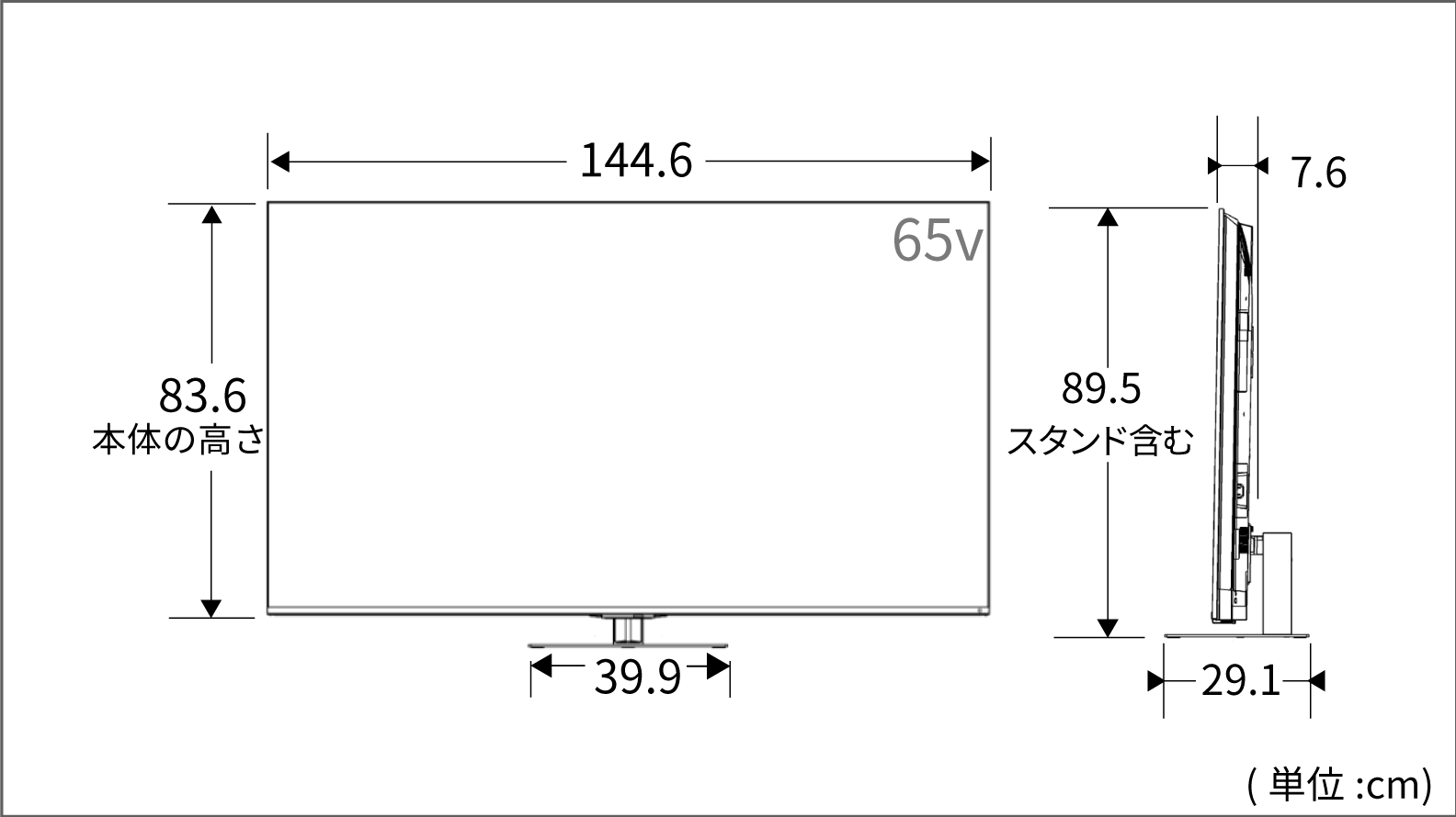 外形寸法(スタンド付き) | 幅 144.6cm,高さ (低)86.5cm/(高)89.5cm,奥行 29.1cm |