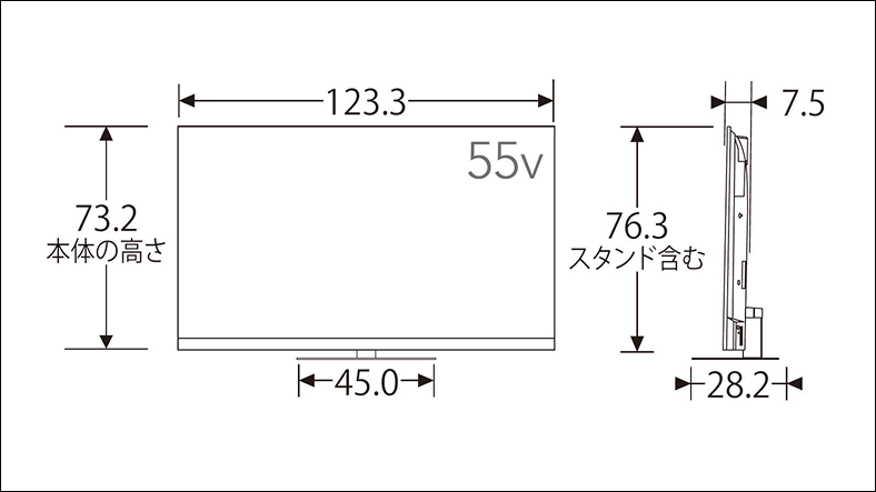 外形寸法(スタンド付き) 幅×高さ×奥行 | 123.3cm×76.3cm×28.2cm |