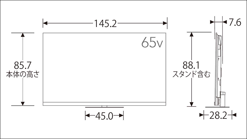 外形寸法(スタンド付き) 幅×高さ×奥行 | 145.2cm×88.1cm× 28.2cm |