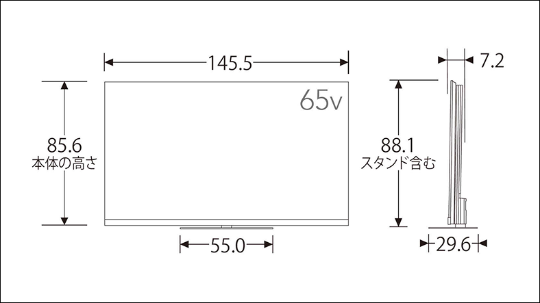 外形寸法(スタンド付き) 幅×高さ×奥行 | 145.5cm×88.1cm×29.6cm |