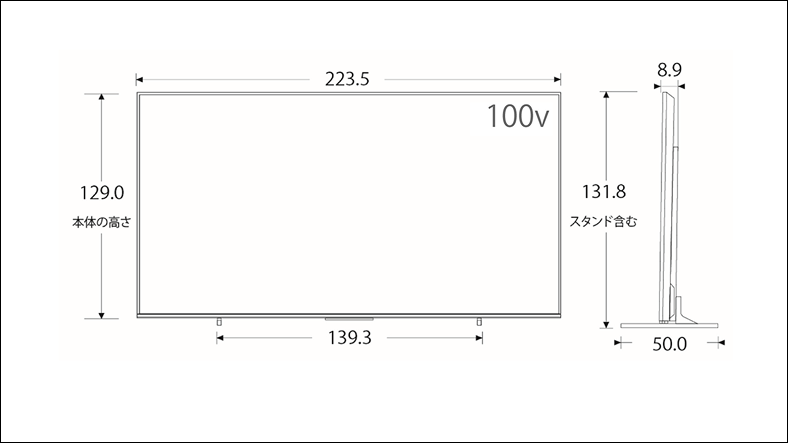 外形寸法(スタンド付き) 幅×高さ×奥行 | 223.5 cm×131.8cm×50.0 cm |